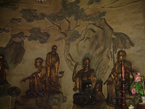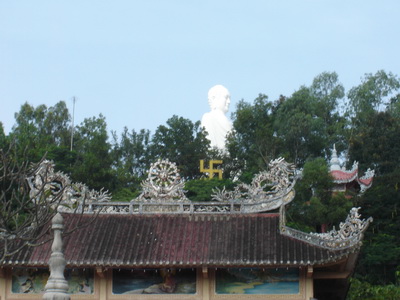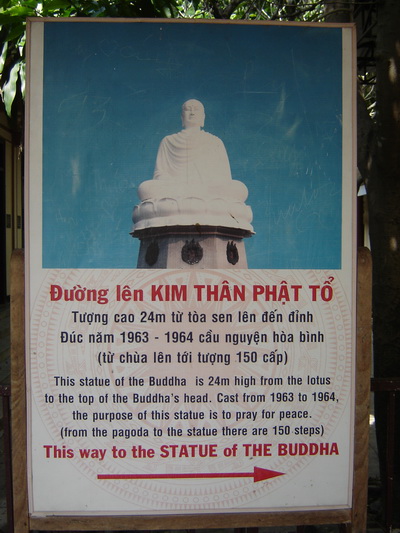 From the Long Son Pagoda, there is a large road leading up to Hai Duc Pagoda along the crest of the hill, where there is a large white concrete statue of Gautama Buddha. The statue was built on the site of the original temple and the statue was cast in 1964 before being installed the following year, under the auspices of Thích Đức Minh, who was the Head of the Buddhist Association of Khánh Hòa Province. The sculpture of the statue was by Kim Điền. From the ground up, the statues is 24 m, and from the base of the statue, it is 21 m. The figure of the Buddha is 14 m while the lotus blossom comprises 7 m. Around the statue are statues of seven arahants. In front of the statue are a pair of dragons, which are 7.20 m long. The statue is visible from afar as one enters the city, from either the national highway or by train.