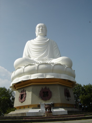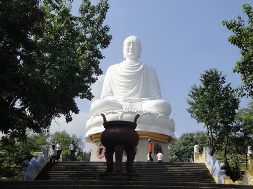Long Son Pagoda nowadays is a complete and breathtaking complex of halls, buildings and gardens. From the Long Son Pagoda, there is a large road leading up to Hai Duc Pagoda along the crest of the hill, where there is a large white concrete statue of Gautama Buddha. From the ground up, the statues is 24 m, and from the base of the statue, it is 21 m. The figure of the Buddha is 14 m while the lotus blossom comprises 7m, This statue can be certainly seen from afar as one enters the city.