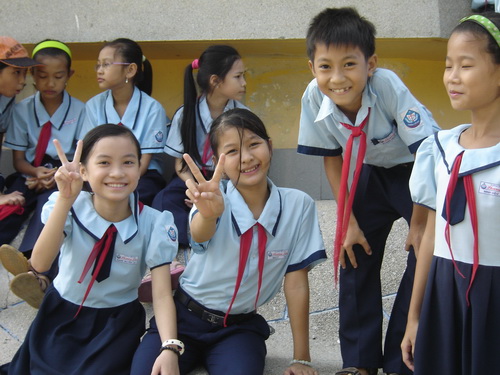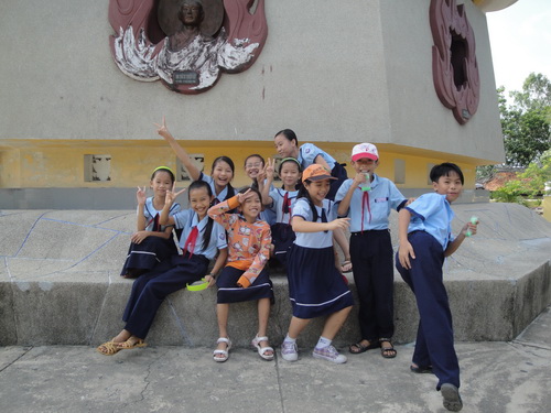 3295. เด็กนักเรียนจากโรงเรียนที่อยู่ใกล้ๆ มาเที่ยวเล่นบริเวณวัด หรือ บริเวณพระพุทธรูปขาว แห่ง Long Son Pagoda หรือ วัดพระพุทธรูปขาว เมืองยาตรัง (Nha Trang) ประเทศเวียดนาม