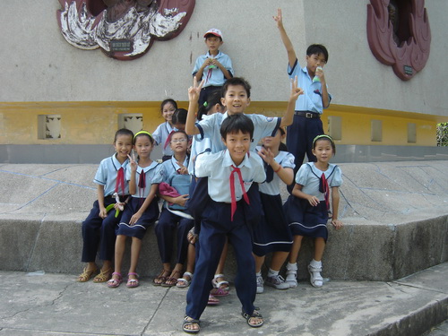 2535. เด็กนักเรียนจากโรงเรียนที่อยู่ใกล้ๆ มาเที่ยวเล่นบริเวณวัด หรือ บริเวณพระพุทธรูปขาว แห่ง Long Son Pagoda หรือ วัดพระพุทธรูปขาว เมืองยาตรัง (Nha Trang) ประเทศเวียดนาม
