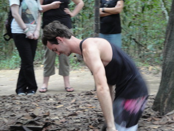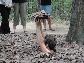 3487. หนุ่มฝรั่งคนนี้ ขอ สาธิต หรือ ทดลอง เป็น "เวียดกง" บ้างอุโมงค์กู๋จี ( Củ Chi tunnels) อำเภอกู๋จี (Cu Chi District) นครโฮจิมินห์ (ไซ่ง่อน) สาธารณรัฐสังคมนิยมเวียดนาม.