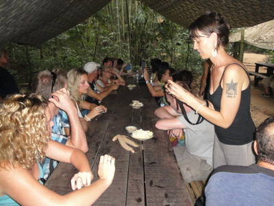 3589. นักท่องเที่ยวชาวผิวขาวให้ความสนใจกับ มันสำปะหลังกับเกลือผสมพริกแห้งป่นอุโมงค์กู๋จี ( Củ Chi tunnels) อำเภอกู๋จี (Cu Chi District) นครโฮจิมินห์ (ไซ่ง่อน) สาธารณรัฐสังคมนิยมเวียดนาม.